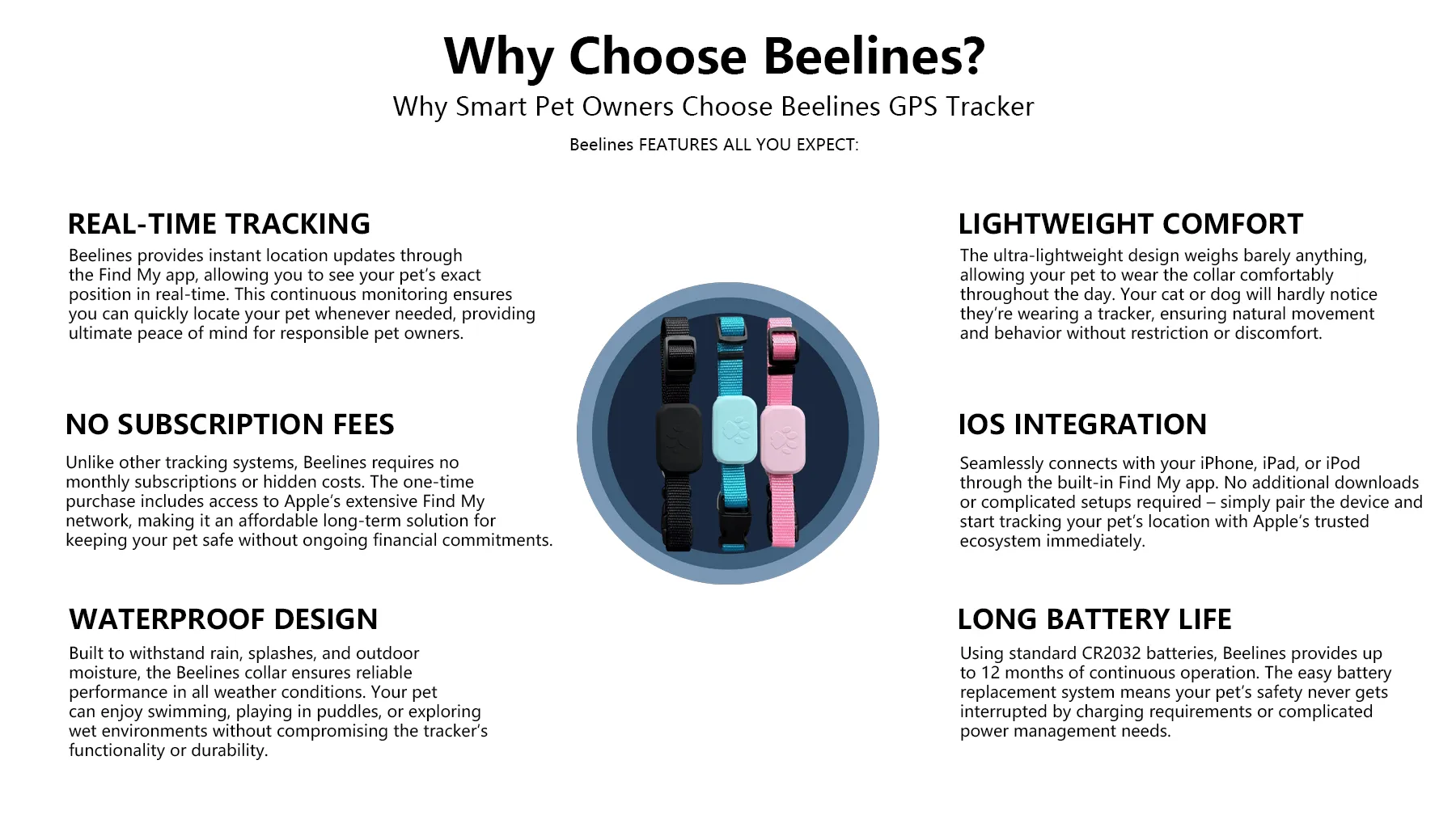 Founded by pet lover Ethan Caldwell, Beelines was born out of frustration with losing track of his adventurous dog. Traditional collars and tags offered no real safety—if a pet wandered too far, there was no way to know where they had gone. He believed technology should give pet owners peace of mind, not more worry.