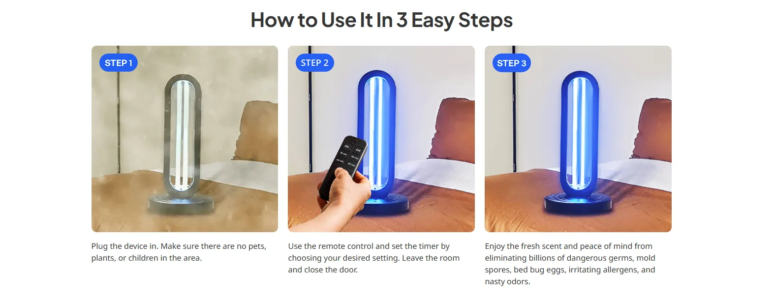 - High-Power, Wide Coverage — Strong output ensures fast, thorough sterilization, ideal for living rooms, bedrooms, and larger spaces.